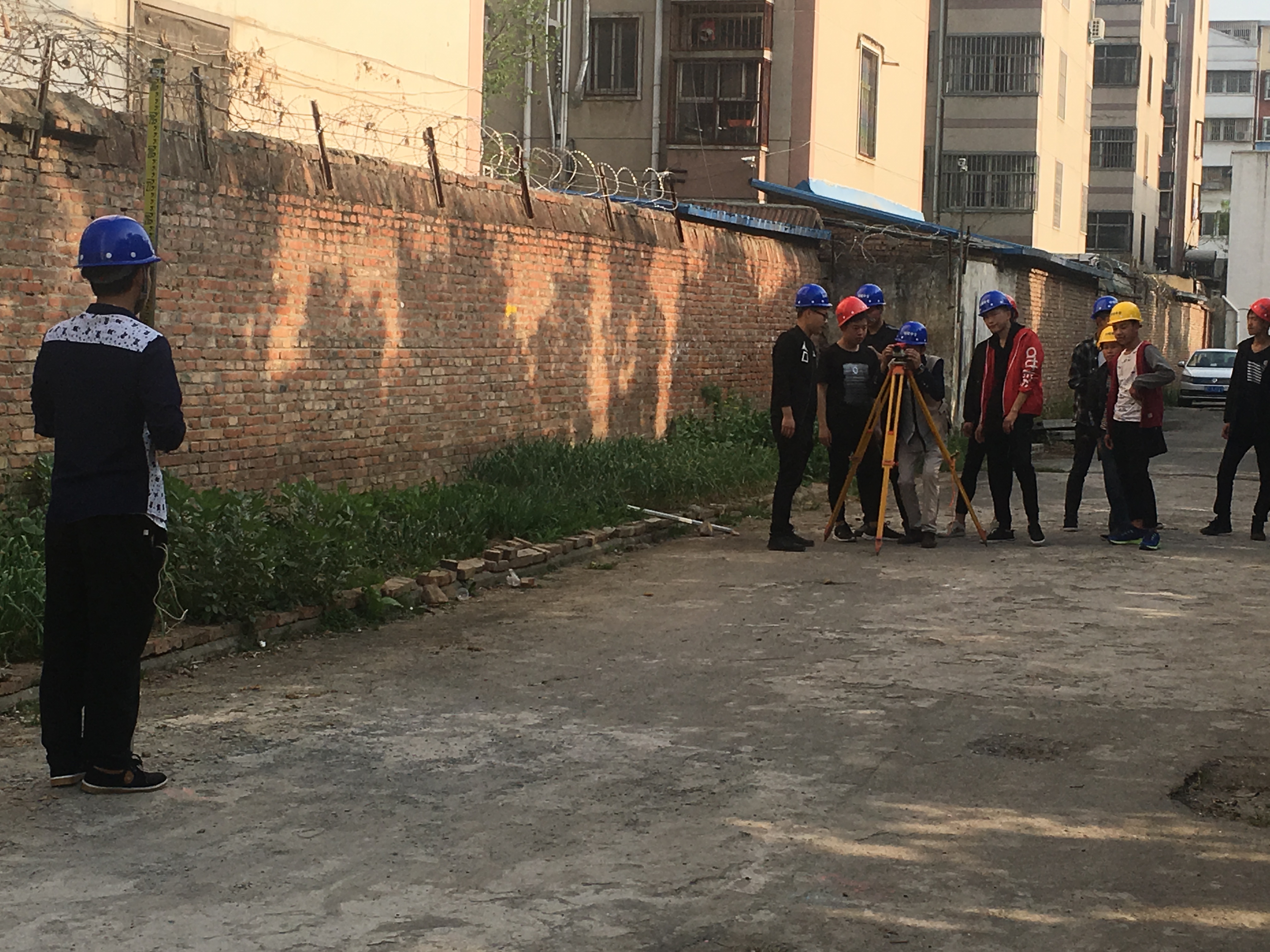 我校建筑工程防水专业的学生,在学习了建筑工程测量仪器水准仪后,信心满满的来到校园一角,进行场地找平实训,只见他们五人一组,有调平仪器的,有扶塔尺的,有记录数据的,学习的热情空前高涨。