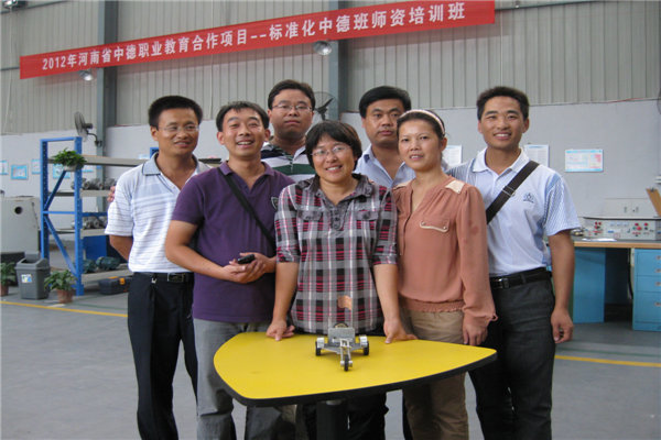 机电专业师资队伍结构合理,综合素质较高:现有专业课教师22人,其中具有中高级职称的教师占60%,国家级骨干教师3人,省级骨干教师12人,双师型教师15人。其中7人远赴德国进行培训学习,取得德国工商协会颁发的职业教育任职资格证书,3人为海尔企业售后维修工程师,2人为周口市教育局特聘中心教研组组长。今年学校开始派所有骨干教师到企业和知名高校学习机器人相关专业知识,为机电专业向机器人方向升级发展奠定基础。