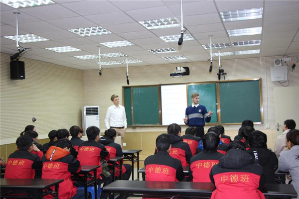自2012年8月中德班开班以来,机电部始终贯彻德国“双元制”教学模式,不断邀请省厅有关领导和德国专家到校指导交流教学及管理工作。2017年12月,北京思威普公司负责人梁薇、省中德合作项目负责人乔卫华、德国专家一行来到我校对17秋中德班的教学及管理工作进行指导交流。通过德国专家示范课的讲解,让我部的教师和学生热情高涨,为以后中德班教师的教学和学生的学习工作积累了宝贵的经验。