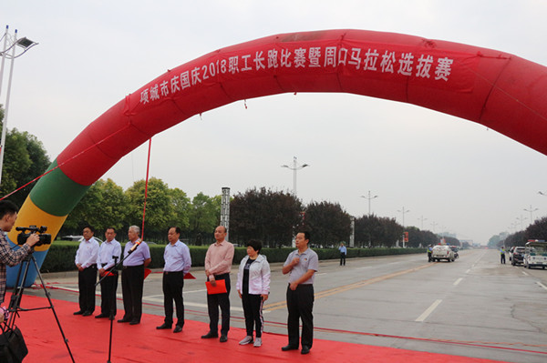为了贯彻落实党的十九大精神,丰富广大干部职工业余文化生活具体体现,我市总工会于9月26日上午,在市体育馆举行了市庆国庆“全市职工长跑比赛暨周口马拉松选拔赛”,市委副书记、政法委书记张文成、市委常委、副市长苏磊、市人大常委会副主任高必民、市政协副主席熊向华、市总工会主席李怀义、党组书记田雨和教体局局长张国旗出席比赛活动。