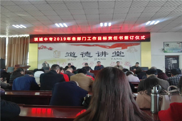 3月14日下午,项城中专在实训楼五楼会议室举行2019年各部门工作目标责任书签订仪式。校长刘福亚及各部门副校长出席了会议。刘校长对本学期各部门工作做了重要指示。并对上学期的工作情况进行了分析和总结,要求各部门认真总结,查漏补缺。会上,各部门负责人上台陆续签订目标责任书,并对本学期的每个阶段各项工作的进度做了详细的说明。