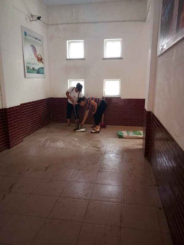 我组教师孟银霞和郭秀红在认真清理地面上的污渍!