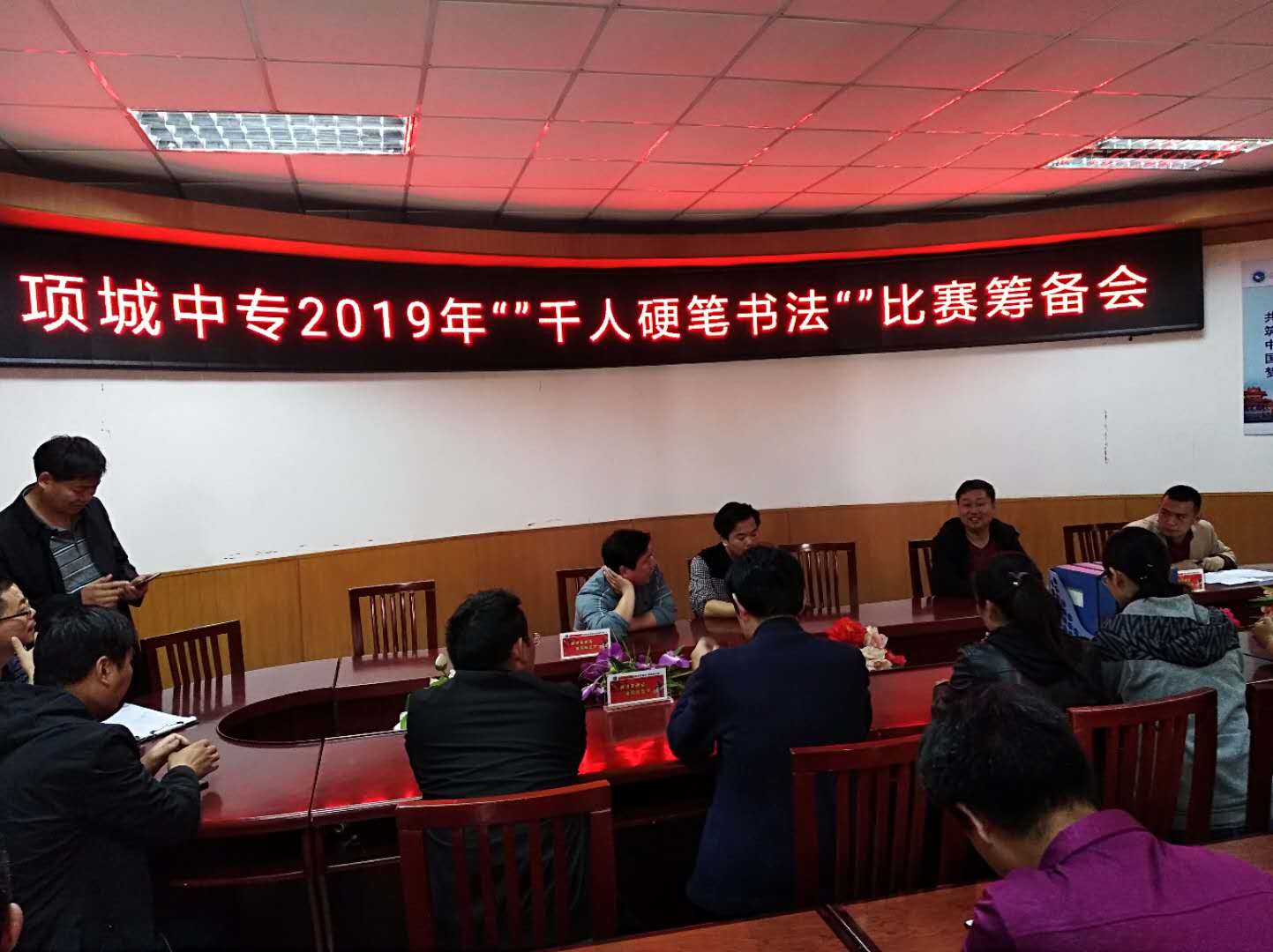 2019年4月24日上午我组教师参加在二楼会议室召开的项城中专2019年“千人硬笔书法”比赛筹备会