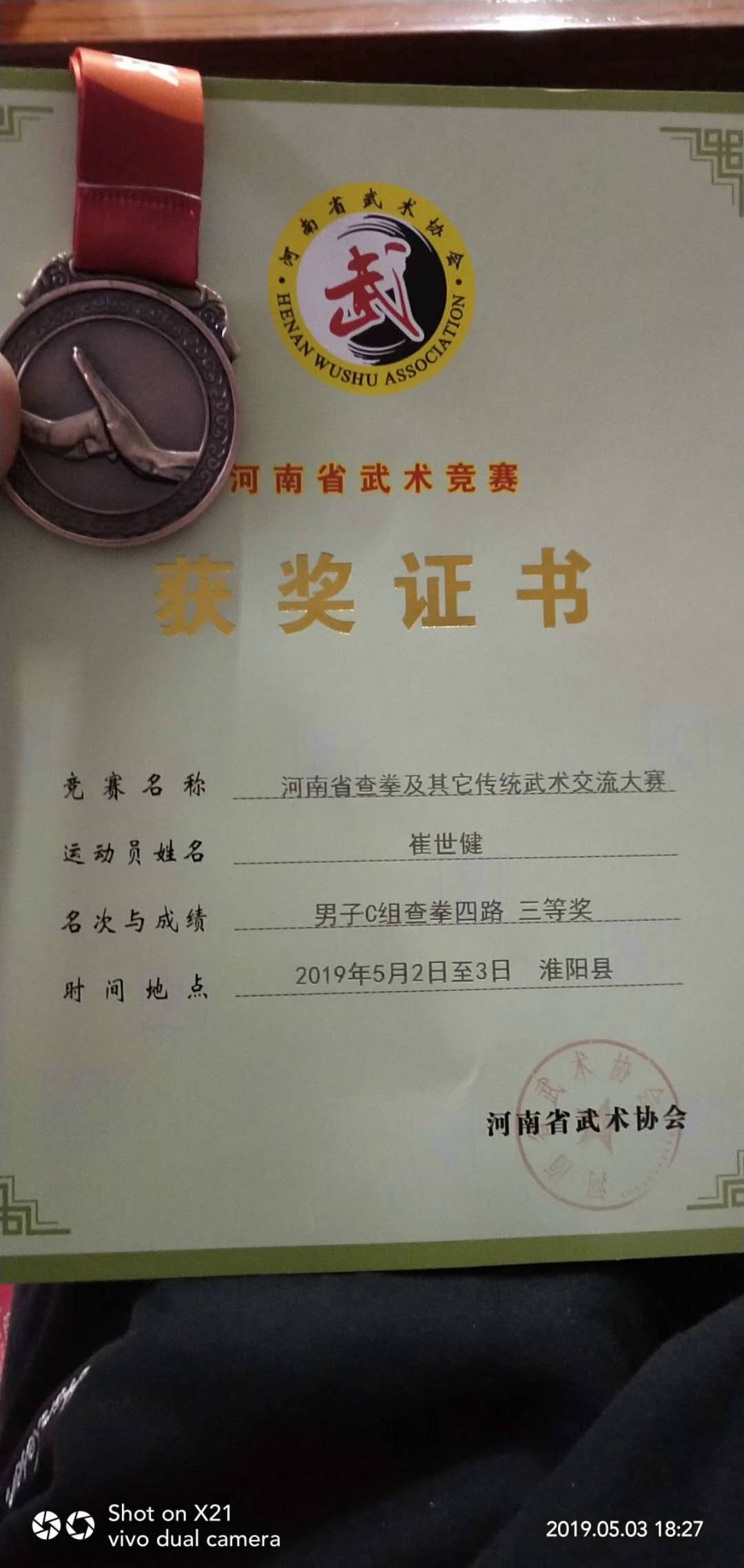 2019年5月2日至3日在河南省淮阳县举办的“武韵中原”河南省第三届传统武术大赛中我校16秋运动训练班学生崔世建获得河南省查拳男子c组查拳四路三等奖。