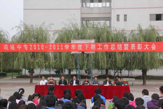 10月19日下午,项城中专在学校篮球场隆重举行2010—2011学年度下期总结表彰大会,全校两千多名师生全部参加。大会由学校副校长付高木主持。本次大会上共表彰了17个文明班级体、22名优秀班主任、67名三好学生、45名优秀学生干部。