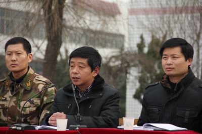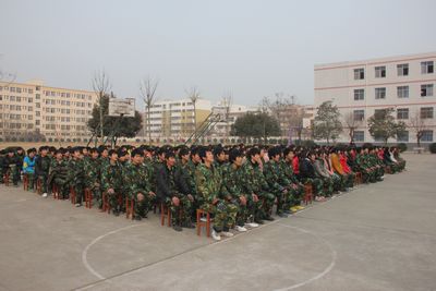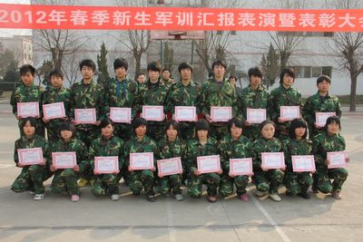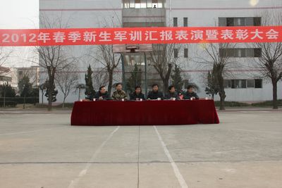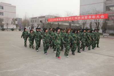 2月17日上午9:30,我校2012年春季新生军训汇报表演暨表彰大会在篮球场隆重举行。到会领导有主管政教、团委工作的副校长付高木同志,团委书记汪长亮同志,政教处副主任李恒立、魏怀明同志,大会由政教处主任张成礼同志主持。全体新生向学校领导和周口市外训连首长汇报展示了军训成果。