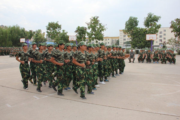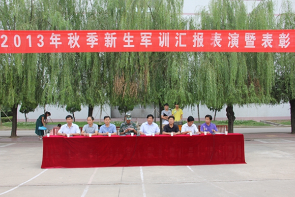 9月2日下午16:00时,我校2013年秋季新生军训汇报表演暨表彰大会在校篮球场举行。到会领导有:高校长,主管师训工作的王校长,主管教务工作的张校长,主管政教、团委工作的付校长,主管招生、就业、电大、函授工作的陈校长,政教处张主任,周口军分区教导队的师队长,大会由校团委书记汪长亮主持。全体新生向学校领导和周口军分区教导队的首长汇报展示了军训成果。