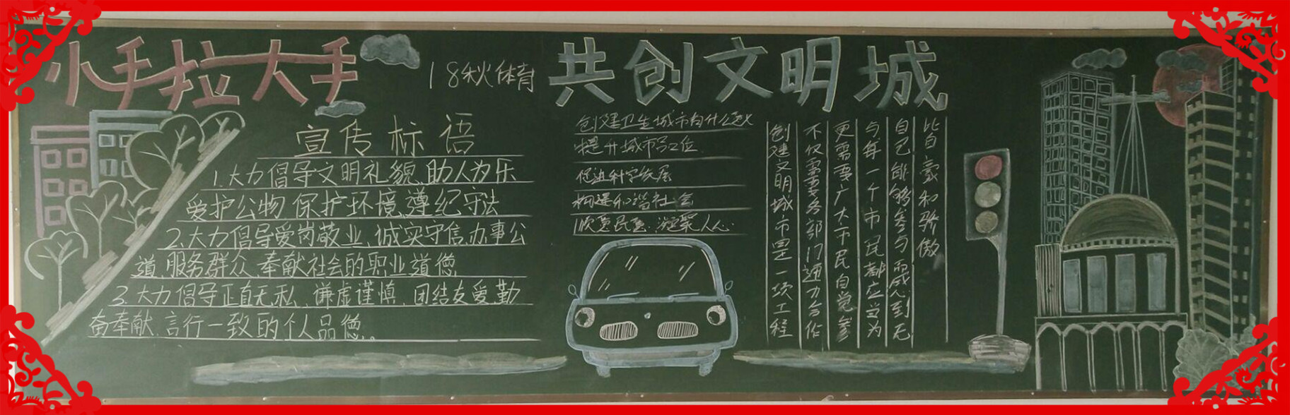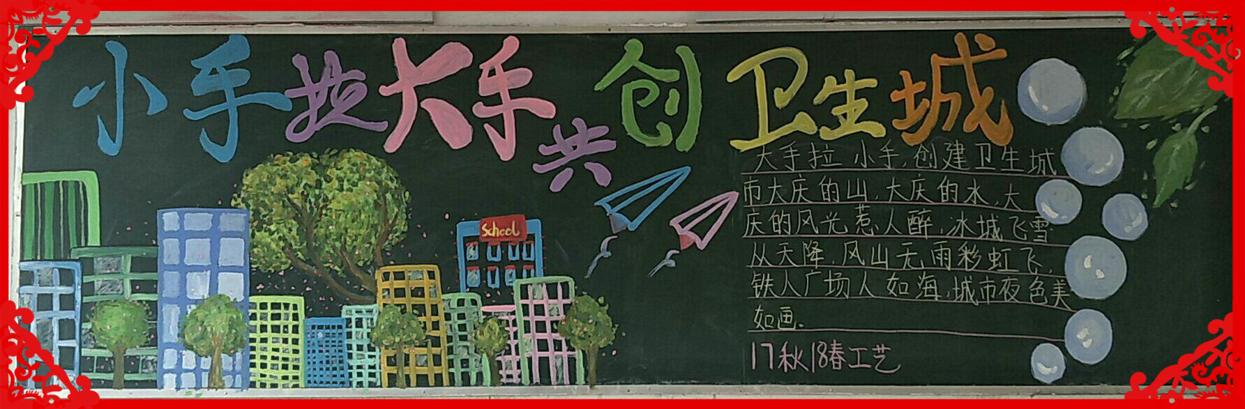 此项活动得到了学校领导的高度重视,在全校范围内开展美化校园行动,学校从教师到学生,从寝室到教室,从办公室到校园全员动员起来为此项工作增添色彩。各团支部也积极行动起来,利用各种形式来宣传、加入、实践创卫活动。各班创办一期“小手拉大手 共创卫生城”主题黑板报,同学们用自己手中的笔表达了对创卫工作的热情。