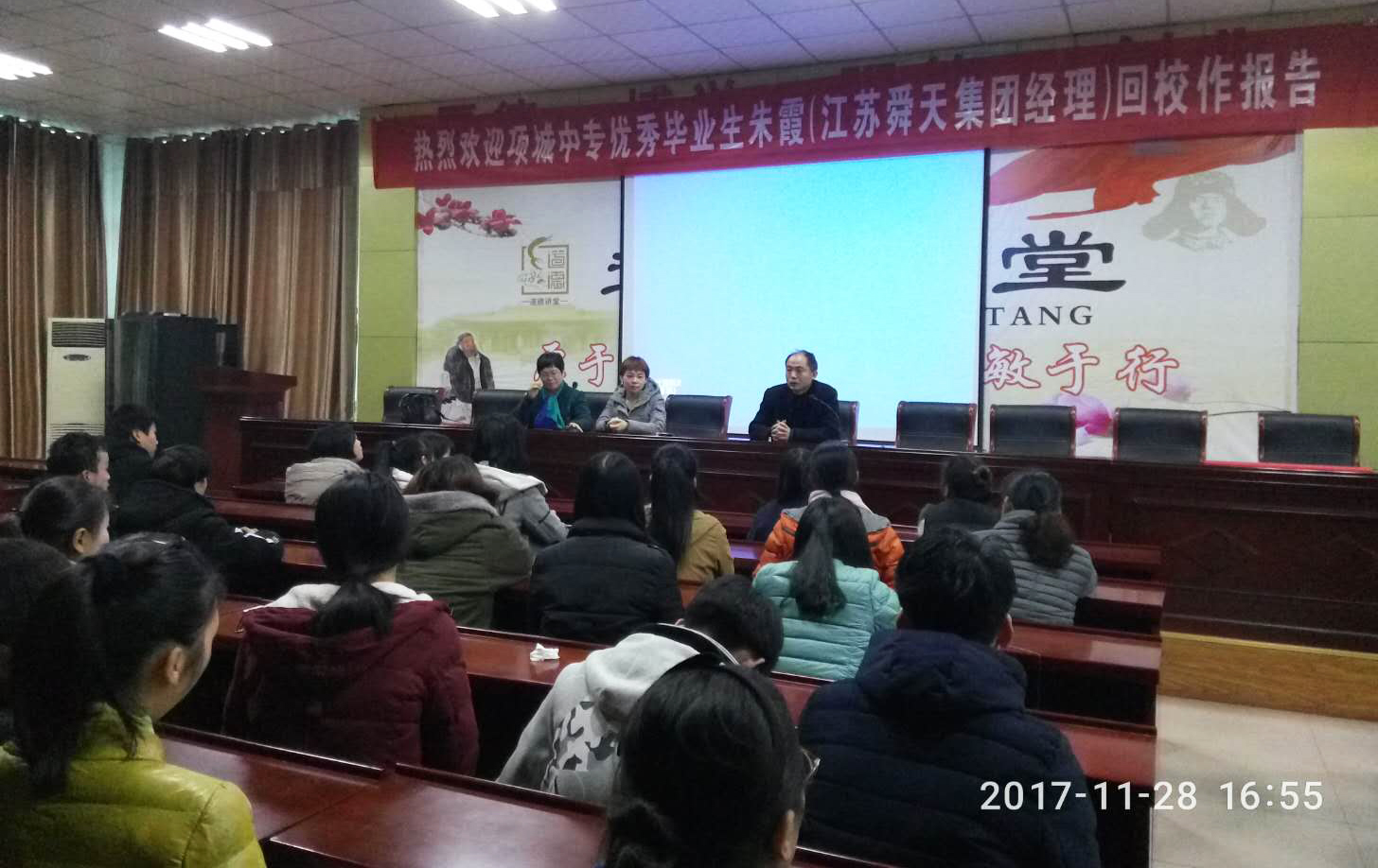 项城中专服装专业优秀毕业生朱霞(江苏舜天集团经理)回母校作报告 2017年11月28日下午,服装专业邀请到99级服装专业学生···