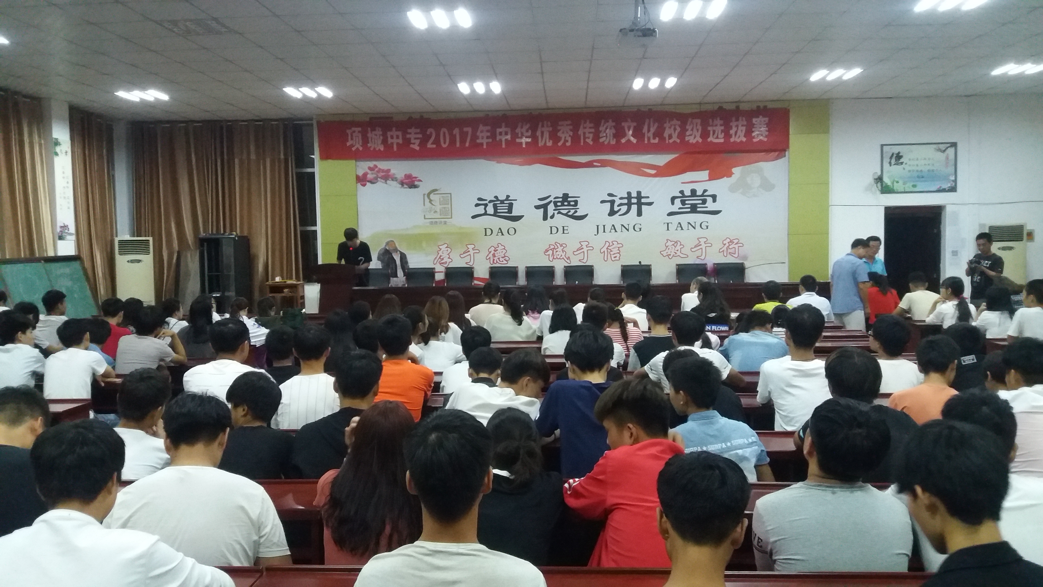 2017年9月16号项城中专在五楼会议室举行了中华传统文化进校园选拔赛活动,为弘扬中华传统文化进校园,积极参与周口市既将举行的优秀传统文化市赛做准备。选手们热情高涨,准备充分,竞赛亮点纷呈,各位评委公平公正,对选手们的成绩认真打分。通过这次活动,对传统文化在校园的进一步弘扬,提升校园文化氛围必将起到积极的推进作用。